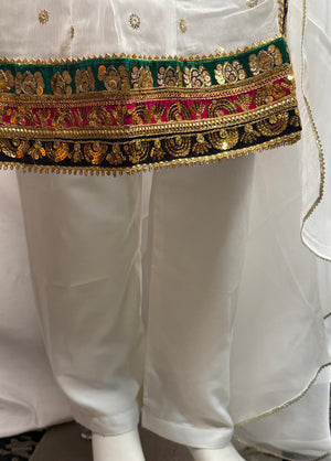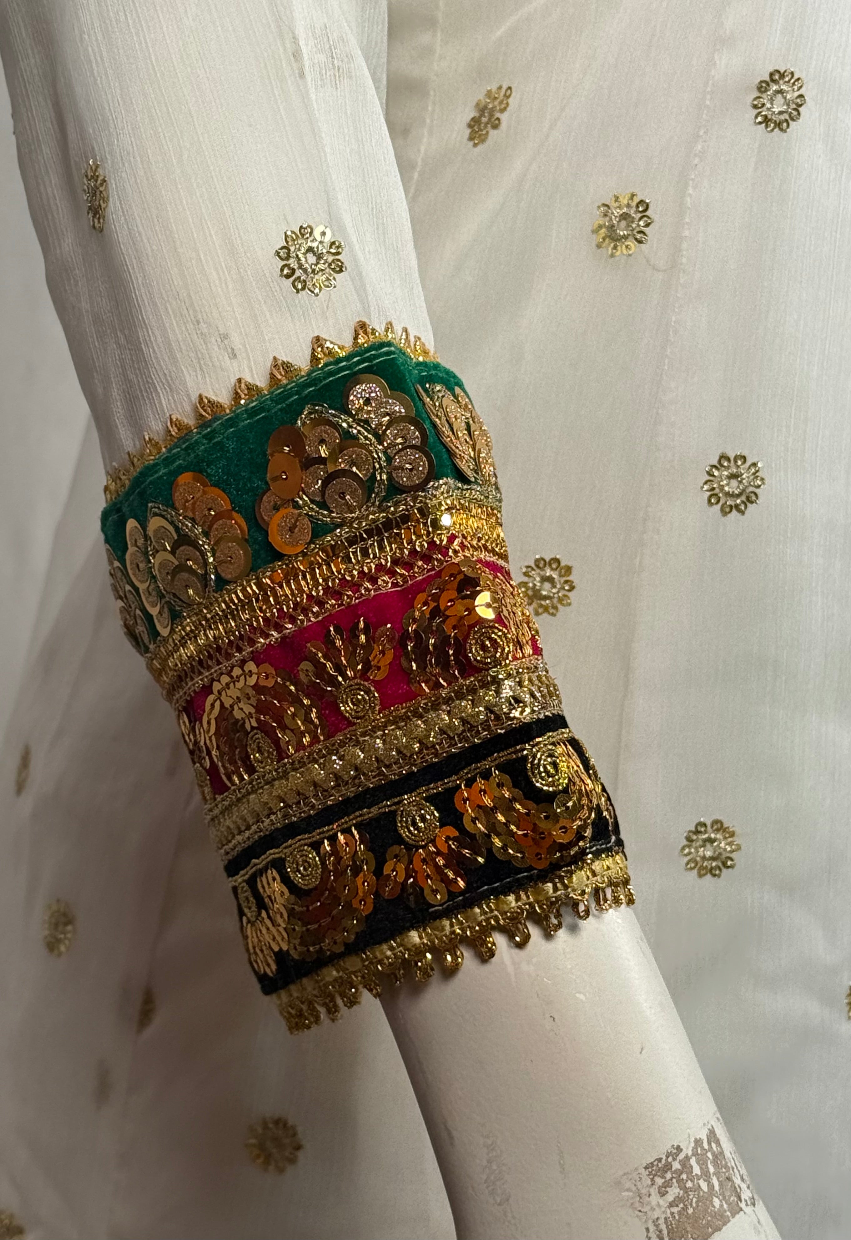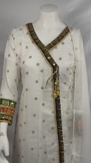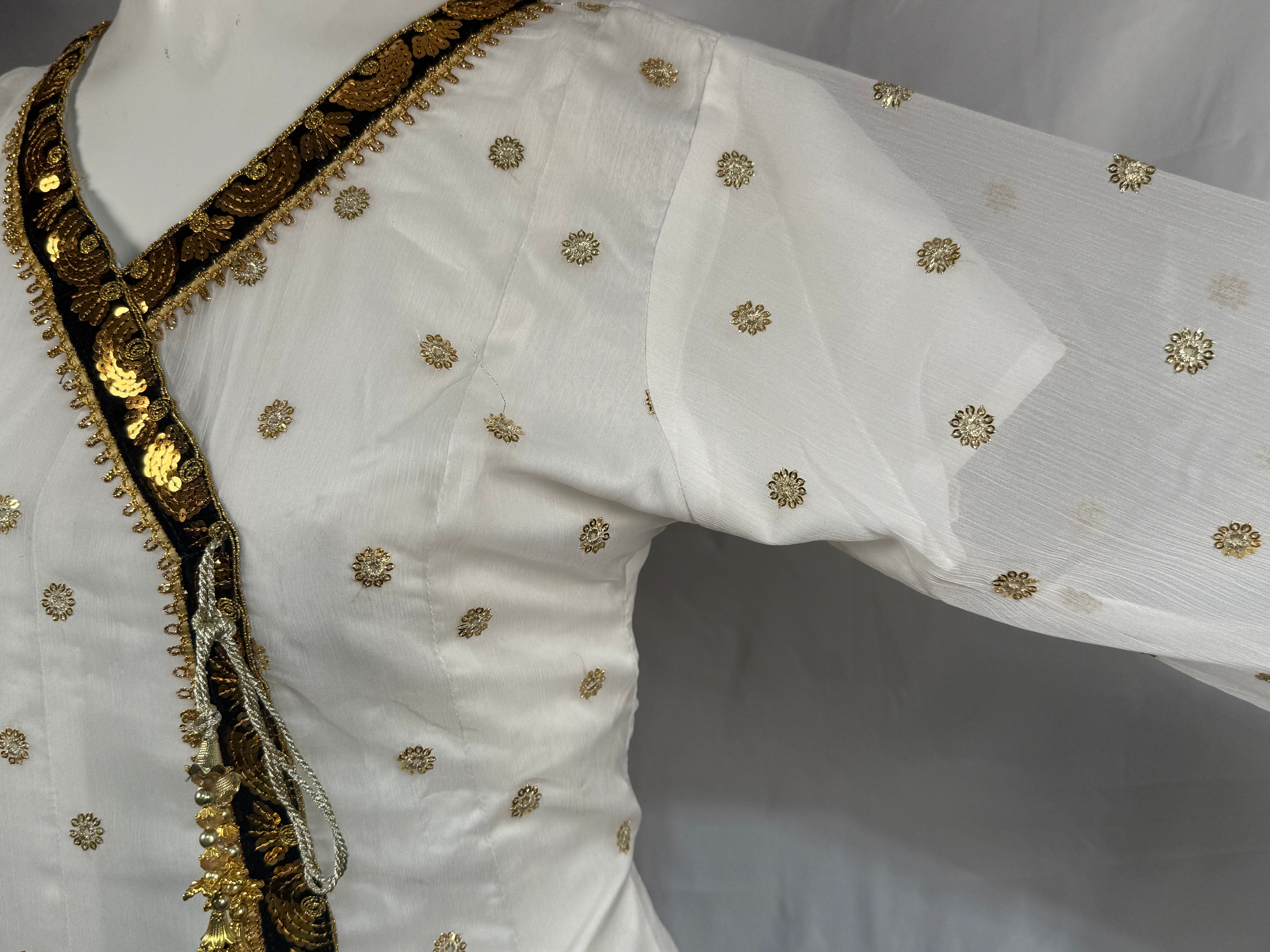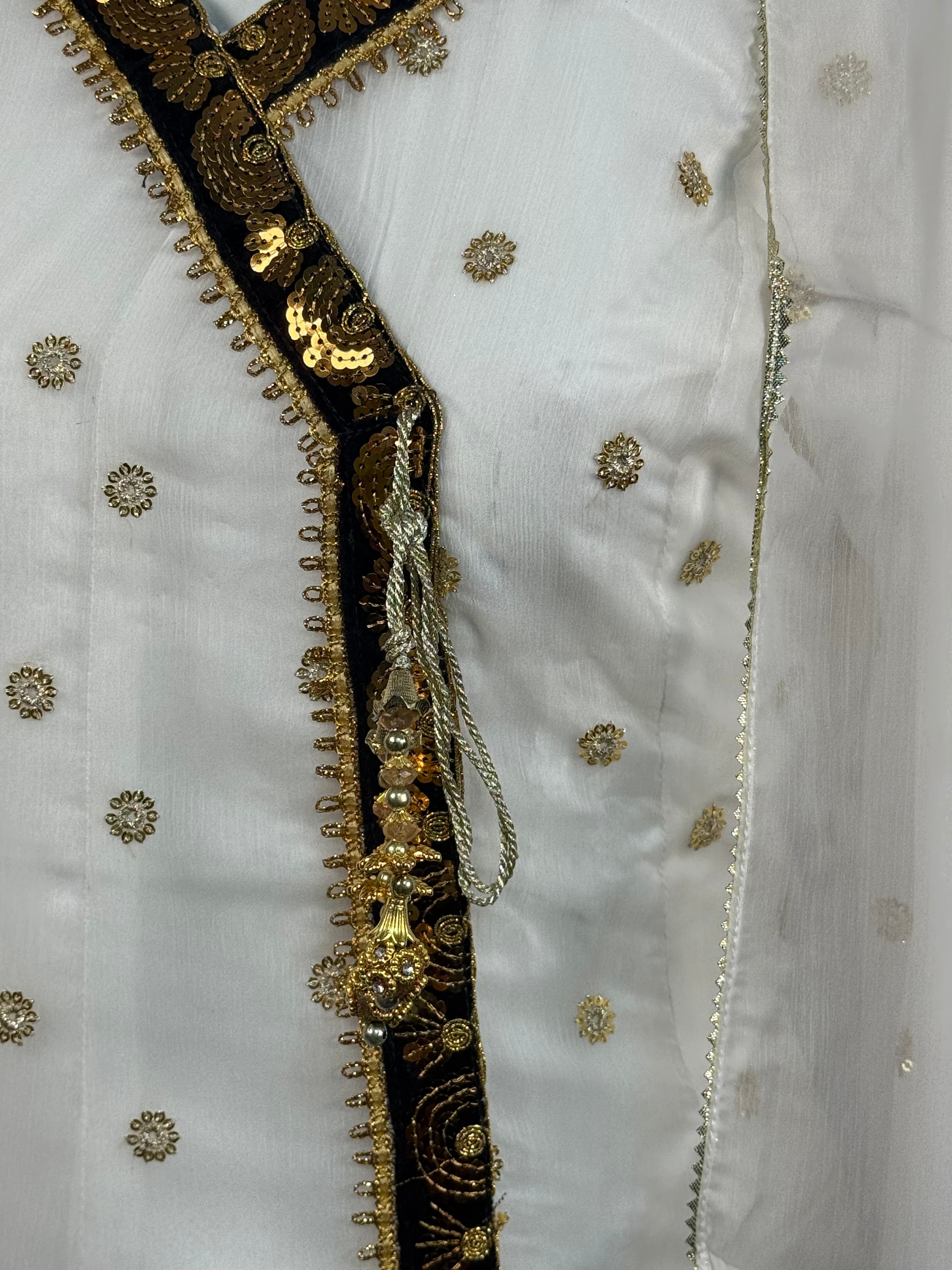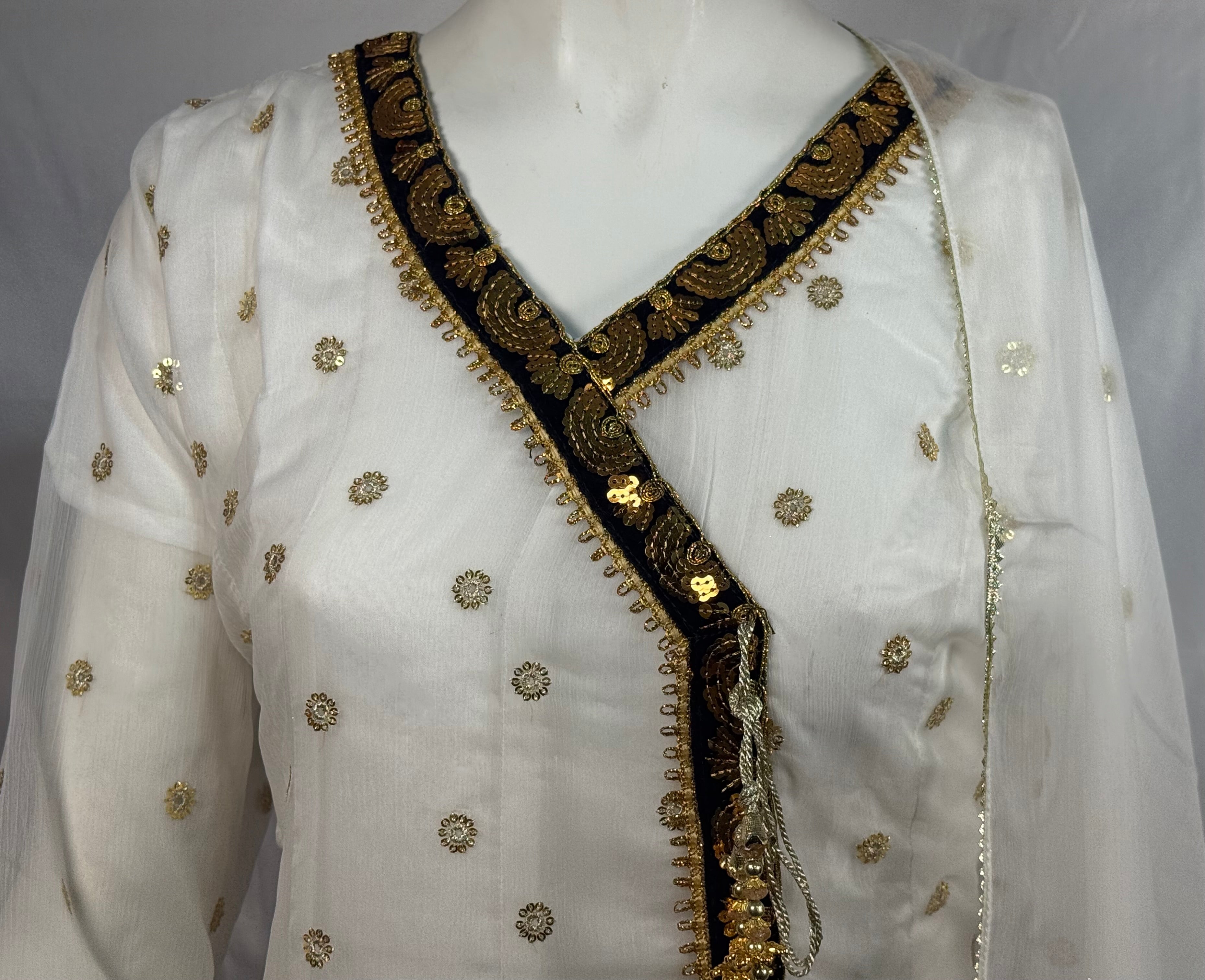 Ladies White Chiffon Angrakah Style 3 Pcs Suit With Embroidery On Shirt (Last-03)