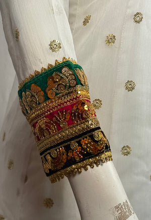 Looking for a show-stopping party suit? Then check out Nadia K from Areeba's Couture. This 3-piece suit is made from chiffon shirt, Sutton fabric Trouser and Chiffon dupatta and is adorned with beautiful embroidery and Golden thread work work. It's the perfect party wear for making a grand entrance and turning heads. So don't hesitate, add this party suit to your cart and get ready to be the life of the party.