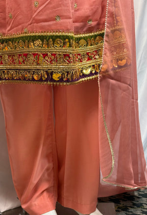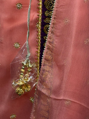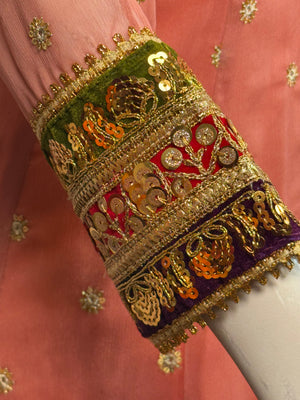 Looking for a show-stopping party suit? Then check out Nadia K from Areeba's Couture. This 3-piece suit is made from chiffon shirt, Sutton fabric Trouser and Chiffon dupatta and is adorned with beautiful embroidery and Golden thread work work. It's the perfect party wear for making a grand entrance and turning heads. So don't hesitate, add this party suit to your cart and get ready to be the life of the party.