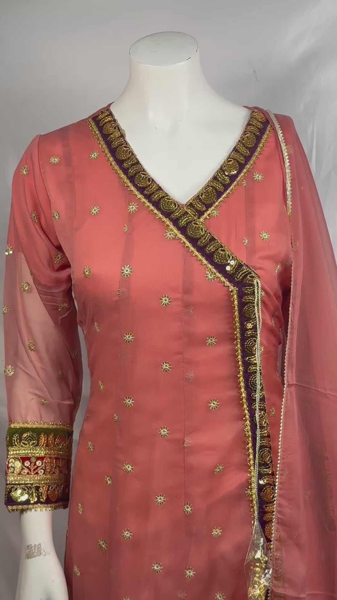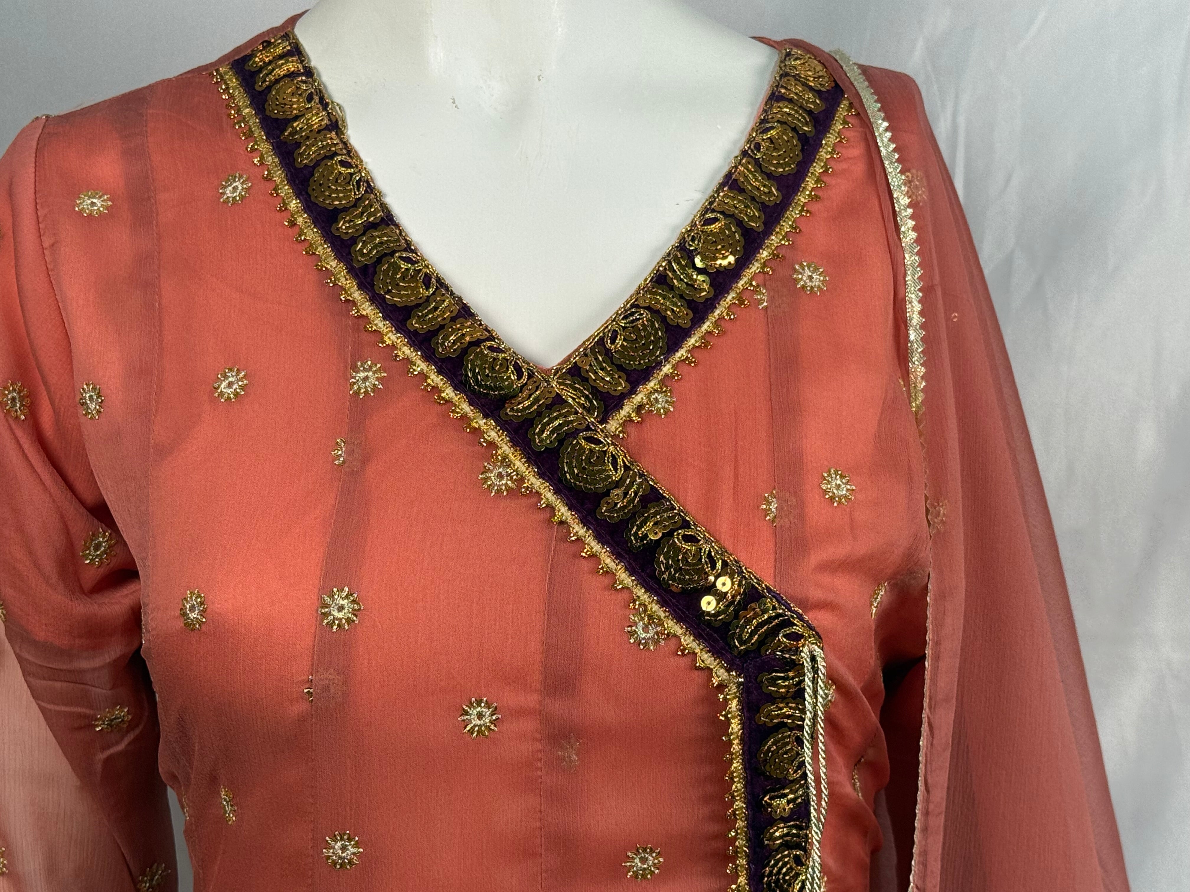 Ladies Chiffon Angrakah Style 3 Pcs Suit With Embroidery On Shirt (Last-07)