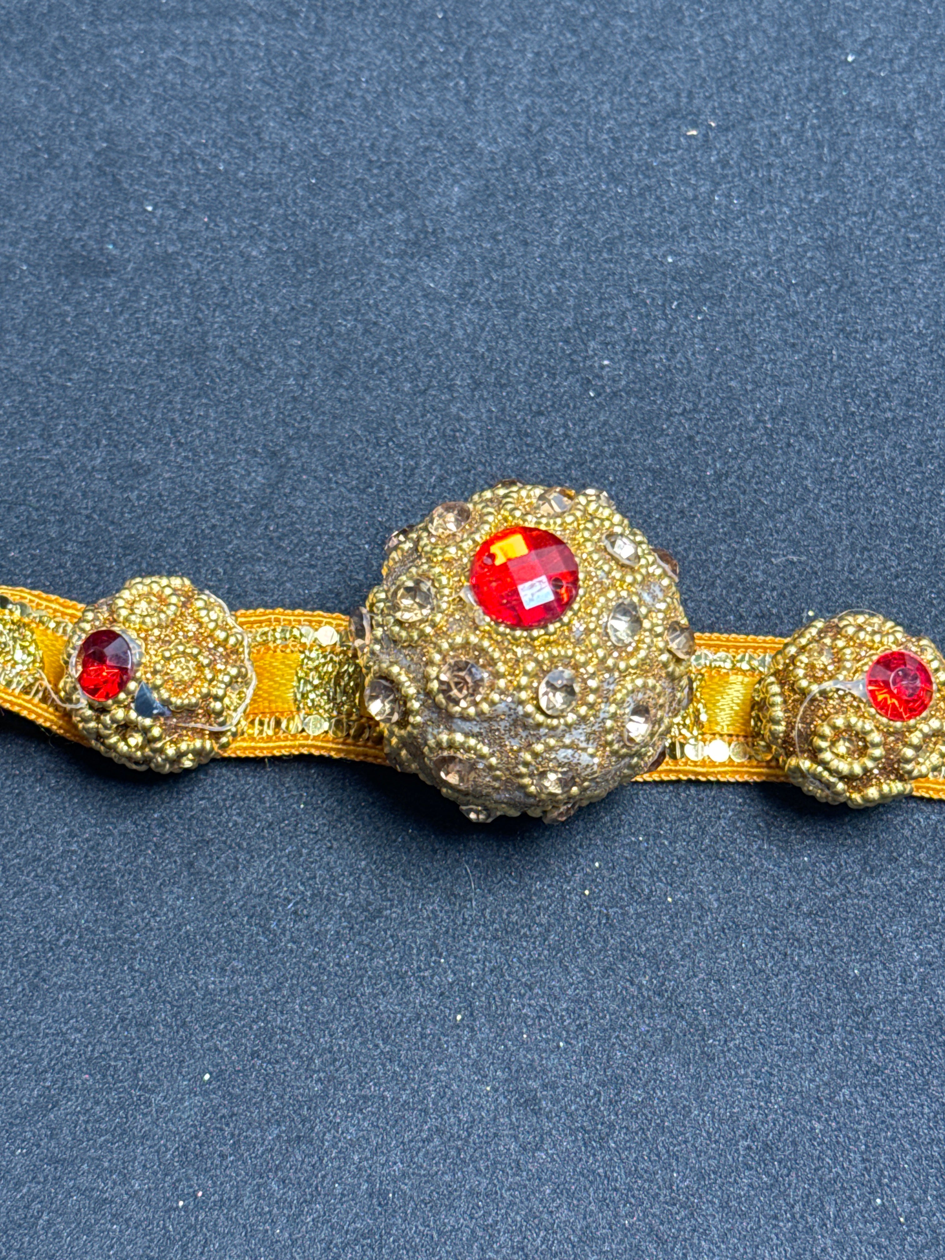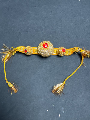 - The Dulha (Groom) Gana is a traditional accessory designed for grooms. It features a central embellishment with a red gemstone, surrounded by intricate detailing. The design includes two decorative elements on either side, adding to its ornamental appeal. The Gana is adorned with fringed ends, enhancing its traditional look. Perfect for ceremonial occasions, this Gana symbolizes the groom's role in the wedding ceremony.