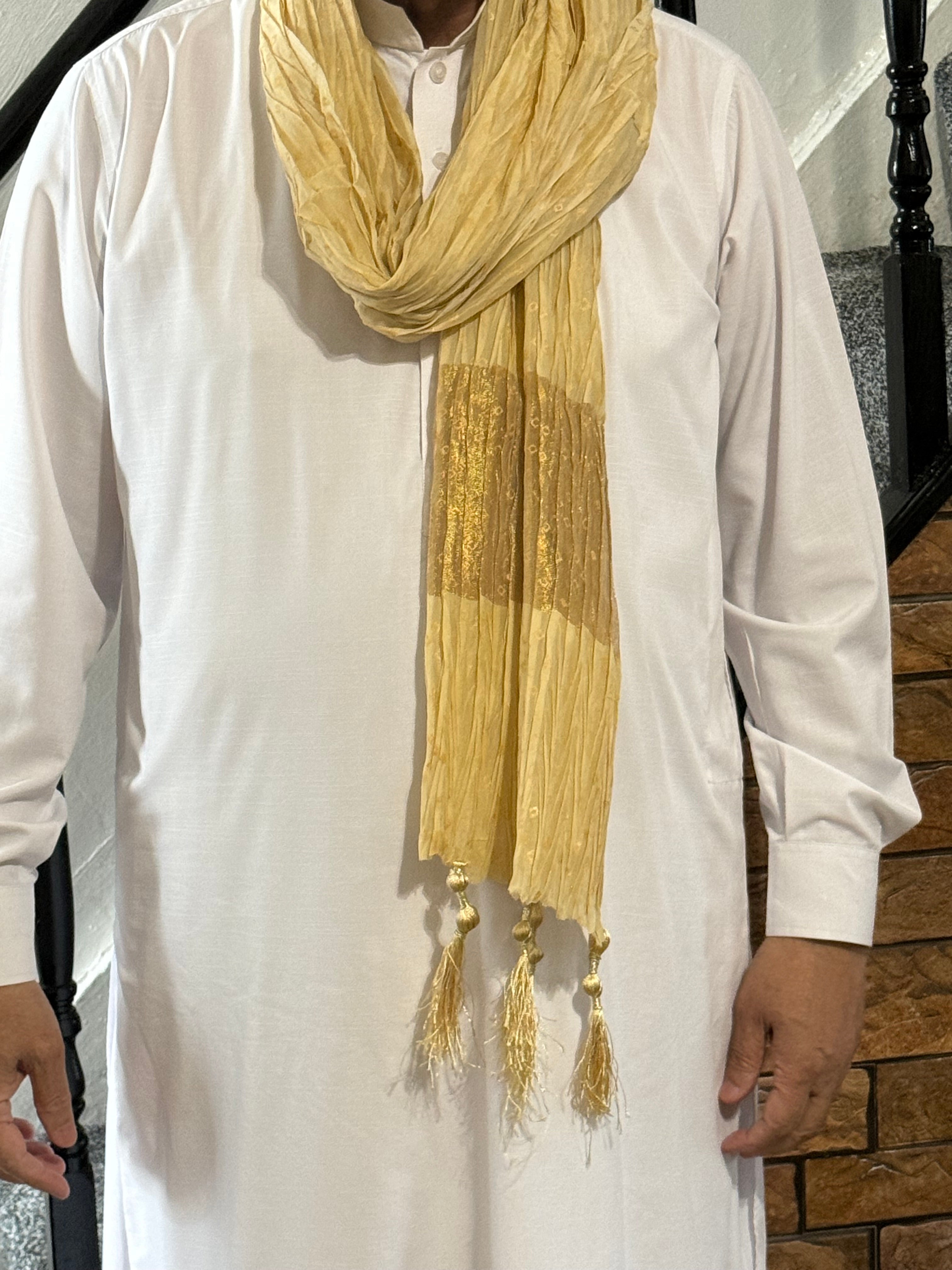 Mehndi Dupatta for the Lads is a traditional mehndi accessory to add a festive flair to special occasions. This wrap around scarf features in Beige colour in a shaded pattern. The lightweight, adjustable fabric makes this a comfortable and versatile choice for boys and gents. Crafted from high-quality materials, it ensures long-lasting durability and exceptional comfort for everyday wear. The timeless design pairs effortlessly with both casual and formal outfits, making it a versatile wardrobe staple.