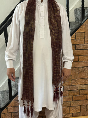 Mehndi Dupatta for the Lads is a traditional mehndi accessory to add a festive flair to special occasions. This wrap around scarf features a Dark Maroon colour in a shaded pattern. The lightweight, adjustable fabric makes this a comfortable and versatile choice for boys and gents. Crafted from high-quality materials, it ensures long-lasting durability and exceptional comfort for everyday wear. The timeless design pairs effortlessly with both casual and formal outfits, making it a versatile wardrobe staple.