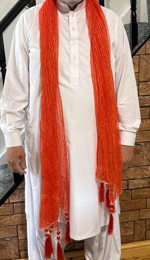 Mehndi Dupatta for the Lads is a traditional mehndi accessory to add a festive flair to special occasions. This wrap around scarf features a Orange colour in a shaded pattern. The lightweight, adjustable fabric makes this a comfortable and versatile choice for boys and gents. Crafted from high-quality materials, it ensures long-lasting durability and exceptional comfort for everyday wear. The timeless design pairs effortlessly with both casual and formal outfits, making it a versatile wardrobe staple.