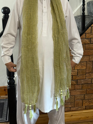 Mehndi Dupatta for the Lads is a traditional mehndi accessory to add a festive flair to special occasions. This wrap around scarf features in Sage Green colour in a shaded pattern. The lightweight, adjustable fabric makes this a comfortable and versatile choice for boys and gents. Crafted from high-quality materials, it ensures long-lasting durability and exceptional comfort for everyday wear. The timeless design pairs effortlessly with both casual and formal outfits, making it a versatile wardrobe staple.