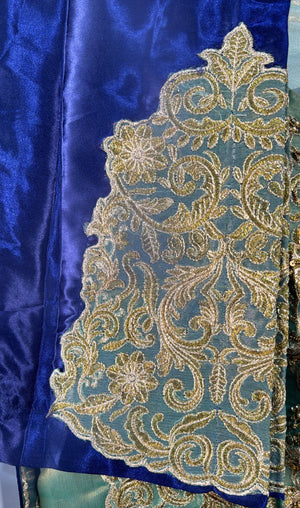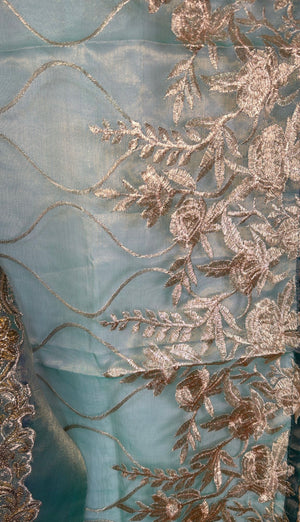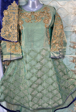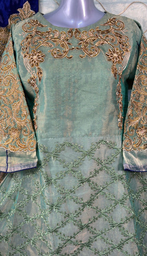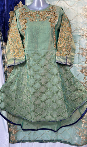Mint Three Piece Frock Suit with Heavy Embroidery Beads Work on Shirt Blue Patchwork Trousers and Dupatta Perfect for Party and Wedding