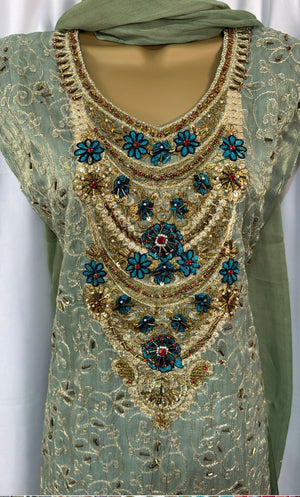 Mint three piece suit with heavy embellishments on top and comes with plain trouser and chiffon duppatta