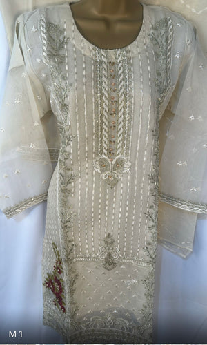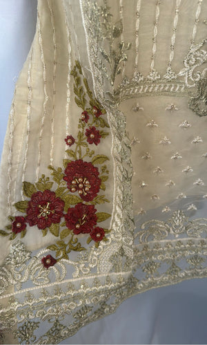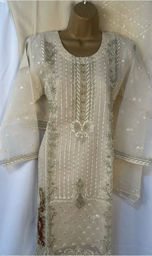 Three piece organza suit with embroidery and sequence work on neck line , perfect for party wear
