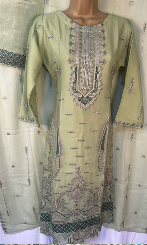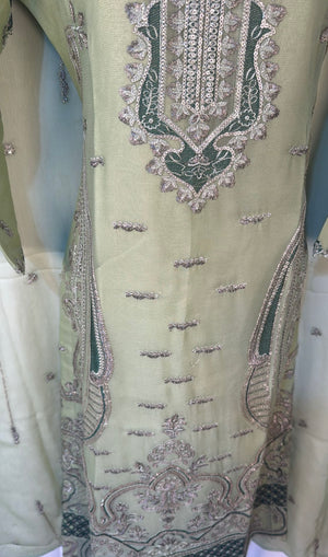 Sage Green Chiffon Three-Piece Suit with Embroidered Shirt & Dupatta Plain Trouser Small Size Available