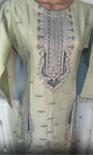 - This sage green chiffon suit comes in a small size. It features a three-piece design, including a shirt with intricate embroidery. The dupatta also showcases detailed embroidery, adding a touch of elegance. The suit includes plain trousers, completing the look.