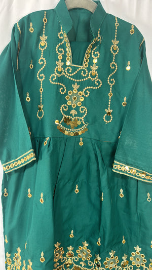 Soft Green Cotton Frock with Trouser Embroidered Top and Gold Accents for Festive Wear