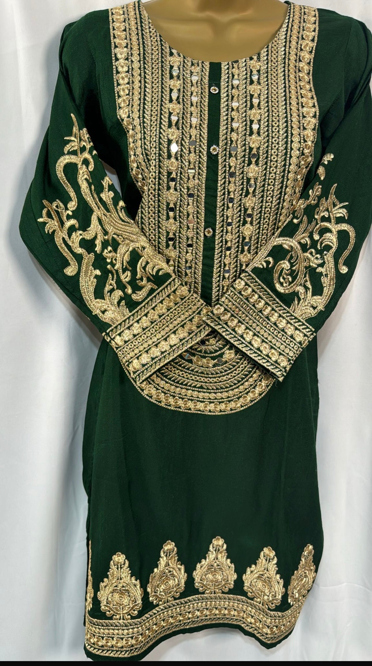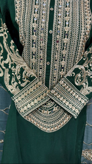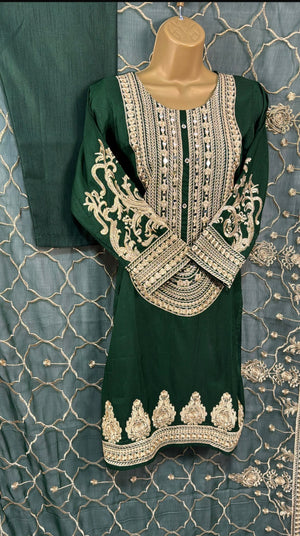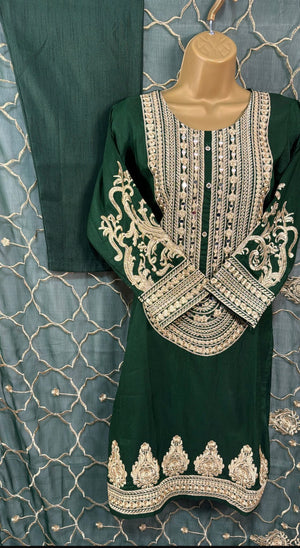 Three piece bottle green suit - heavily embroidered on shirt's damin, neck and slvees. Perfect for any occasion