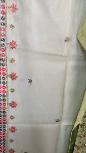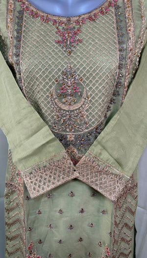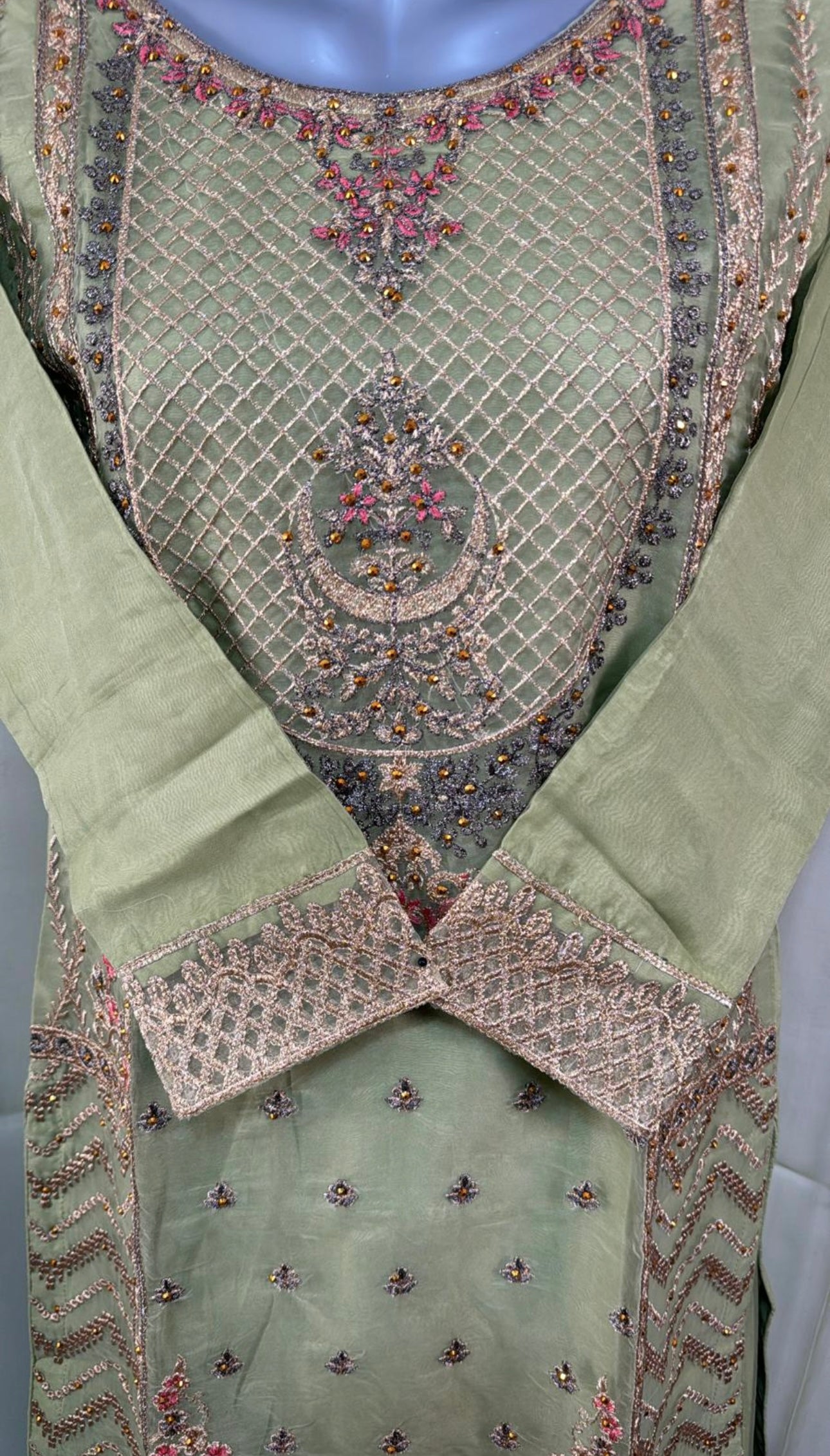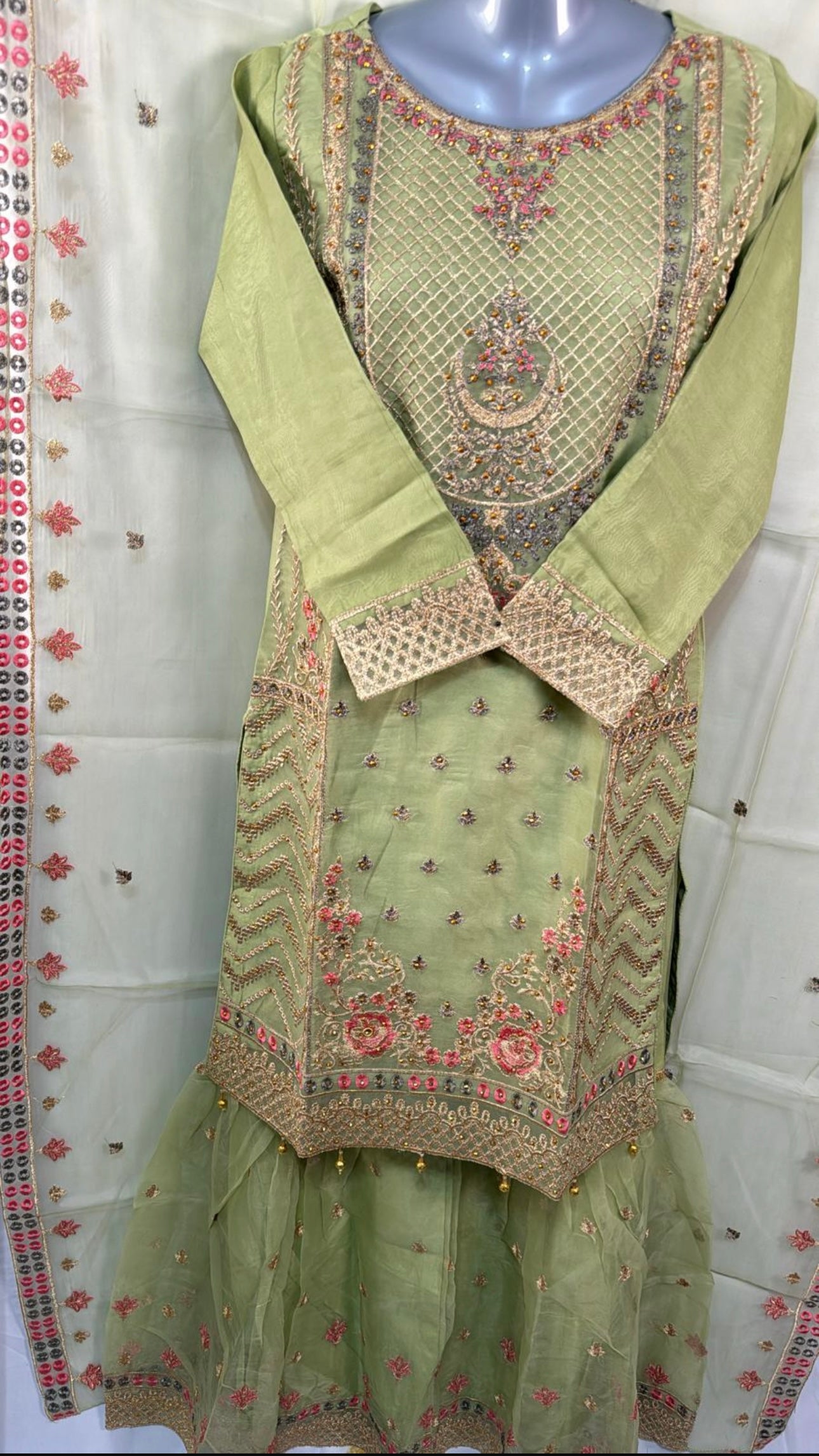 Sage Green Organza Gharara Set Three Piece with Beautiful Embroidery and Stone Work Kameez Gharara Trousers and Dupatta for Elegant Stylish Wear