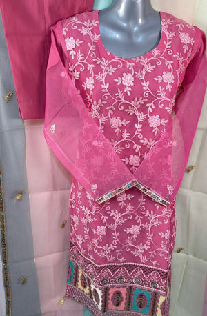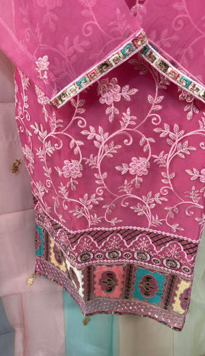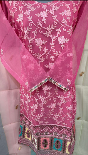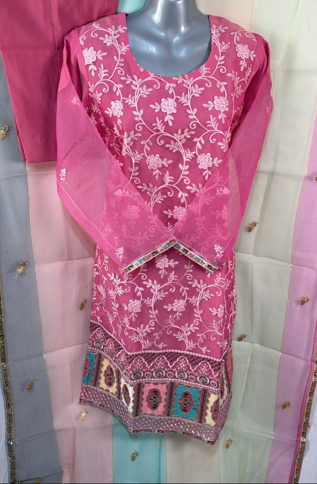 Three piece organza suit with multi colour Dupptta and plain trouser , is embroidery work on trouser , comes for any occasion
