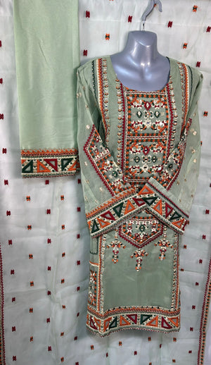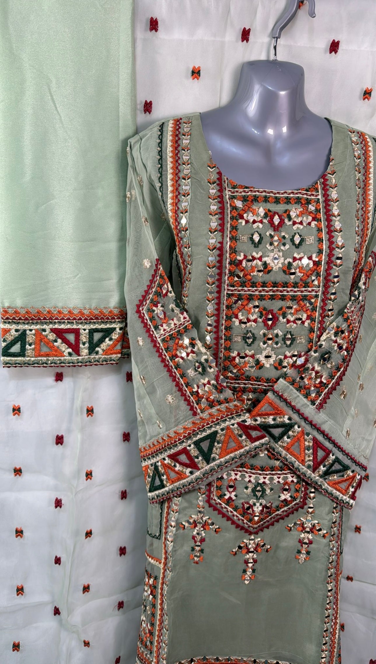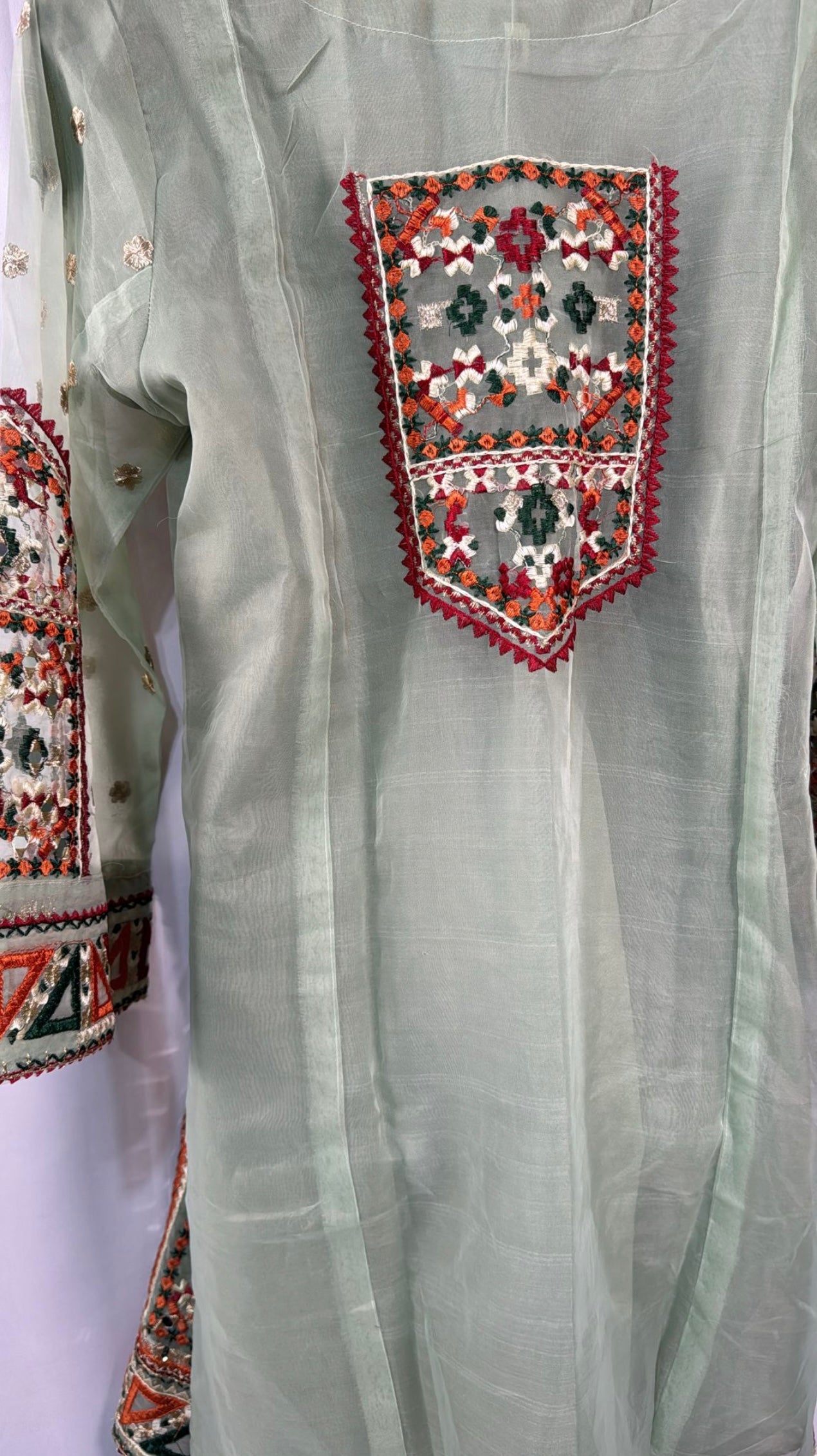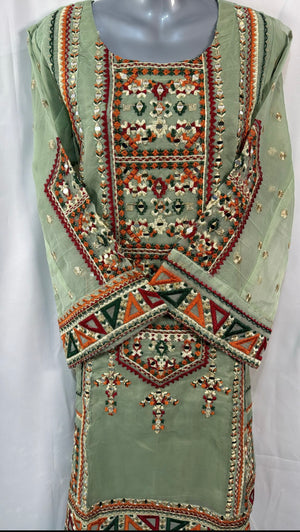This three piece traditional suit comes with embroidery work on shirt front , sleeves and on back , comes with embroidered dupatta and trouser with patch work