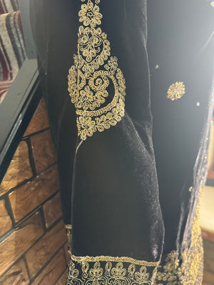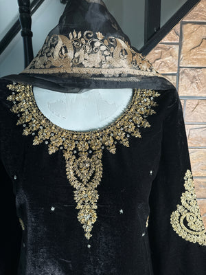 Women Black Valvet Suit with Heavy Embroidery & Pearls Work Includes Net Embroidered Dupatta and Silk Shalwar